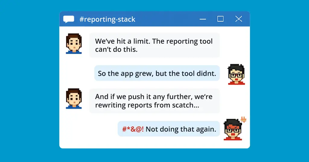 The reporting library you picked for the first release becomes the constraint: ad‑hoc scripts, undocumented flags, and layout rules scattered across C# code. At some point, someone says what everyone already knows: “We’re going to have to replace this.”